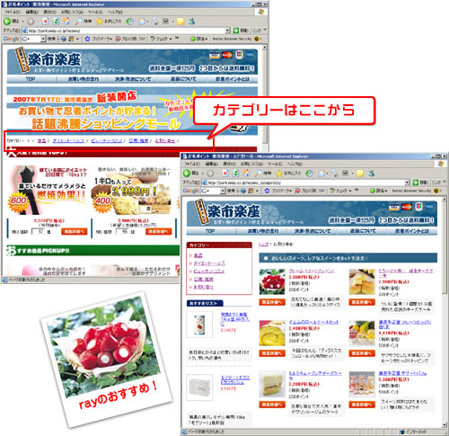 私のオススメは、『お取り寄せ』カテゴリー。 今日、『楽市楽座』企画担当の『姫』が欲しいカテゴリーとか商品があったら教えて~って言ってました♪私は、健康志向が強いので「栄養たっぷりの雑穀米」とか「抹茶ミルク味の青汁」とか「ミネラルたっぷり六億年前の塩」とか、そういうのに弱いです。金額は安くなくてもいいから質のいい食品や栄養補助食品がほしいな★ それでは、また! |